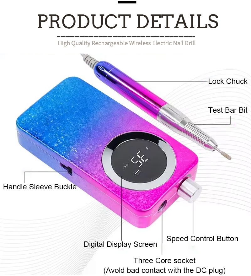 Tsarin nuni na wannan 30,000 rpm na ƙusa na ƙusa na lantarki yana da kunnawa / kashewa da gaba / jujjuya jujjuya don jimlar kunna maɓalli guda ɗaya, mai saurin caji mai sauri a ƙasa, ƙwanƙarar rawar da za a iya maye gurbin a saman, da matsakaicin matsakaicin matsayi uku don saduwa da buƙatu iri-iri.