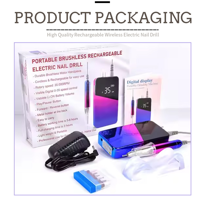 Abubuwan da ke cikin wannan kunshin ƙusa na ƙusa mai tsawon rpm 30,000 yana da samfurin alƙalami mai yashi, kebul na cajin USB, littafin koyarwar samfur, da akwati mara nauyi da ɗaukuwa.