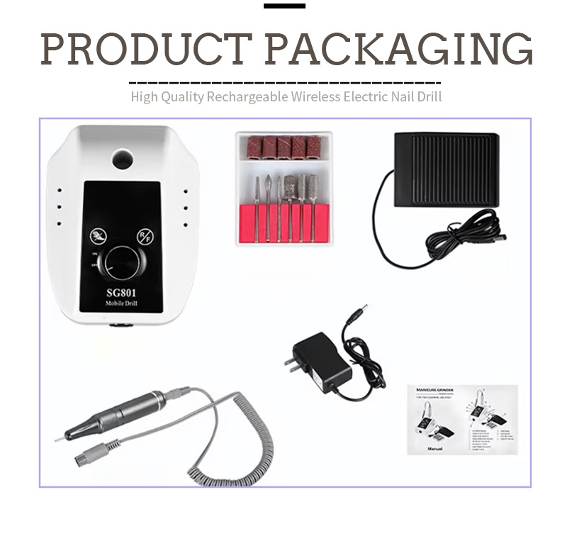 Abubuwan da ke cikin wannan kunshin ƙusa mai ɗaukuwa na 35,000 na lantarki yana da samfurin alƙalami mai yashi, kebul na cajin USB, littafin koyarwar samfur, da akwati mara nauyi da ɗaukuwa.