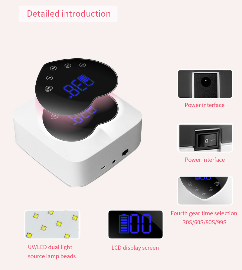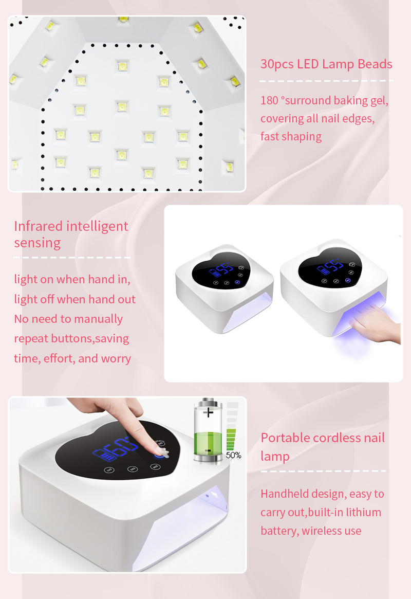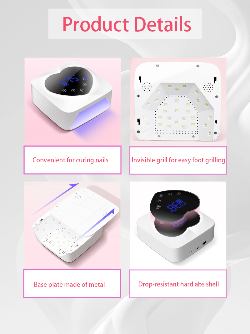 Samfurin yana tabbatar da manne bushewa ba tare da raguwa ba. Maɓuɓɓugar haskensa biyu suna ba da ɗumi mai laushi don hana canza launin hannu da damuwa ido, wanda ya dace da hannaye da ƙafafu biyu, yana ba da sakamako mai saurin bushewa.