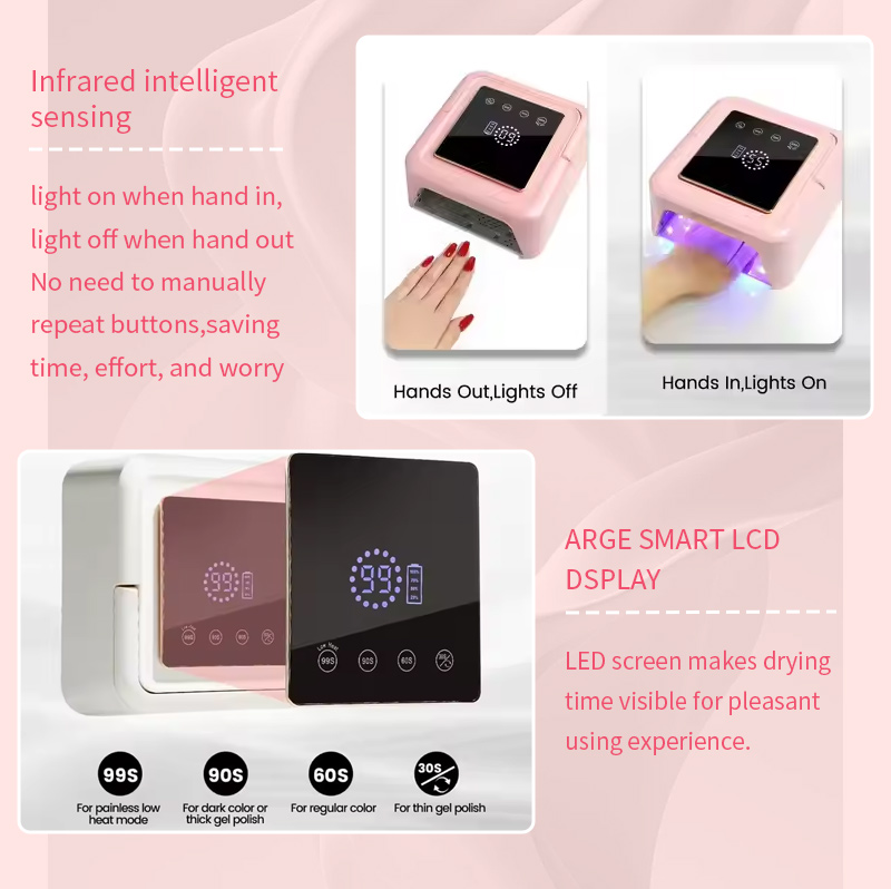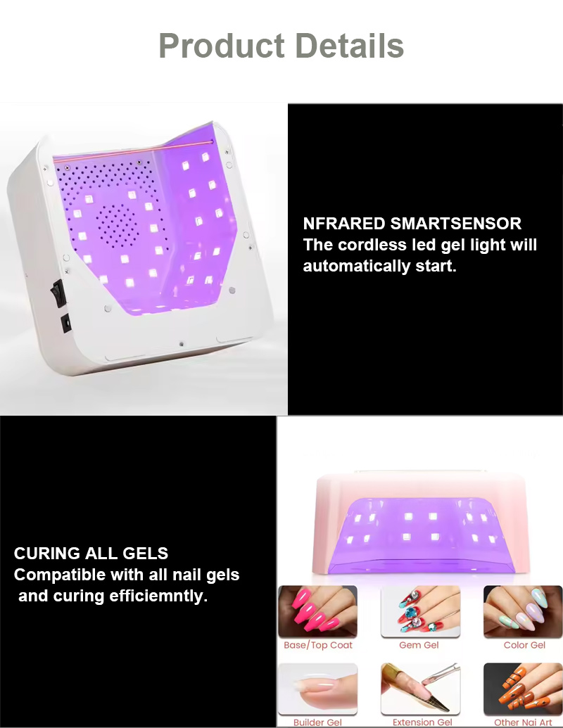 Wannan babban ingancin gel ƙusa goge mai saurin bushewa fitila yana tabbatar da bushewar manne ba tare da raguwa ba. Maɓuɓɓugar haskensa biyu suna ba da ɗumi mai laushi don hana canza launin hannu da damuwa ido, wanda ya dace da hannaye da ƙafafu biyu, yana ba da sakamako mai saurin bushewa.