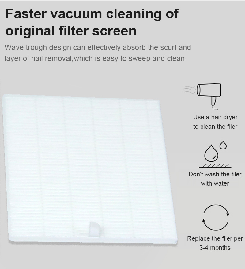 Za'a iya cire samfurin don tsabtace tacewa, tace tace don ɗaukar amfani da laushi brush dace da sauƙi mai sauƙi don tsabtace, za a iya sake amfani da tace.