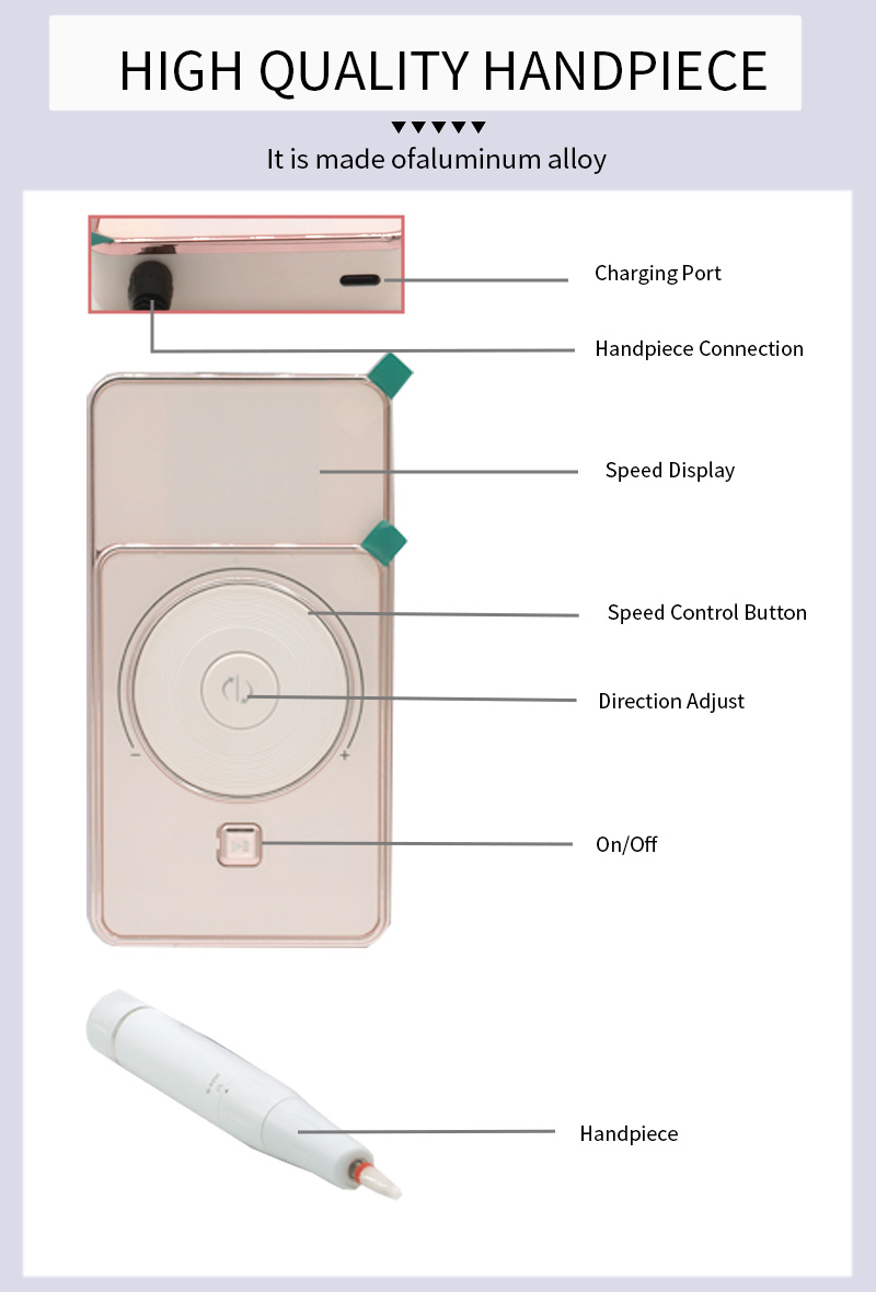 Wannan ƙirar nunin ƙaramar ƙarar ƙarar ƙarar ƙarar ƙarar ƙarar alƙalami ƙirar ƙira, tare da soket ɗin alƙalami, nunin kristal ruwa na LCD na iya nuna adadin juyi / iko / shugabanci, maɓalli mai saurin sauri, maɓallin kewayawa agogo / agogo baya, maɓallin dakatarwa, 30,000 rpm ƙwararrun injin, dunƙule-in kulle niƙa kai.