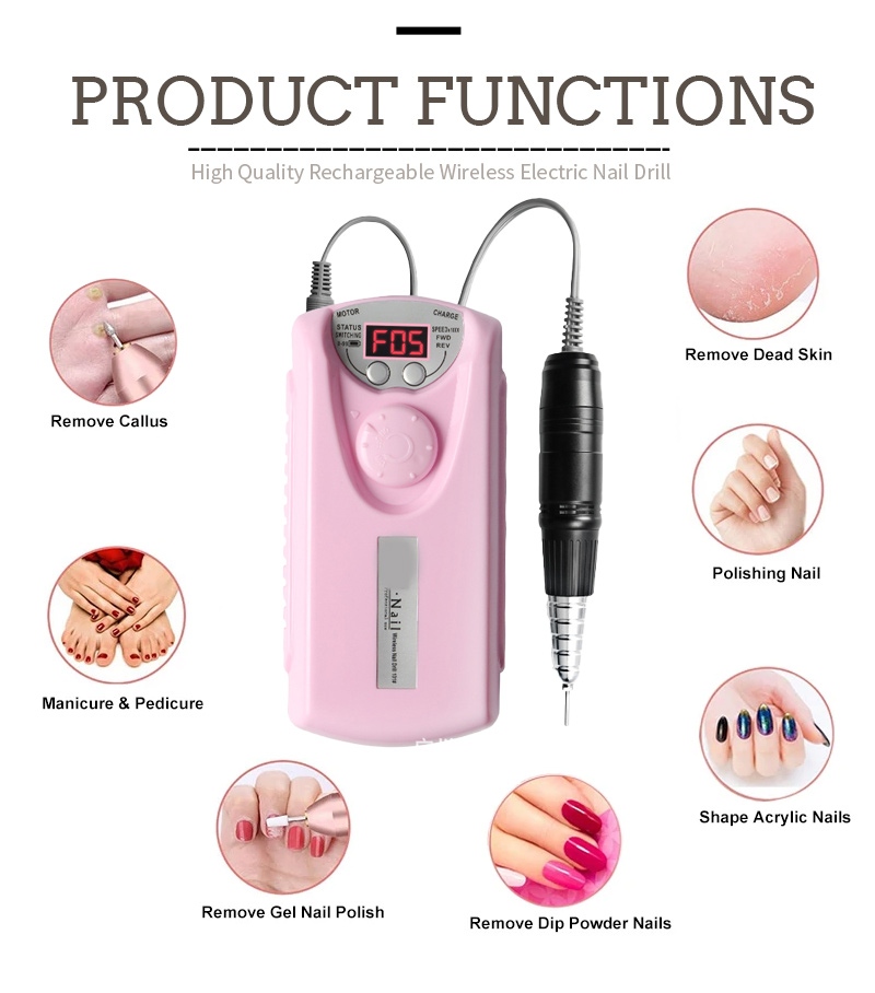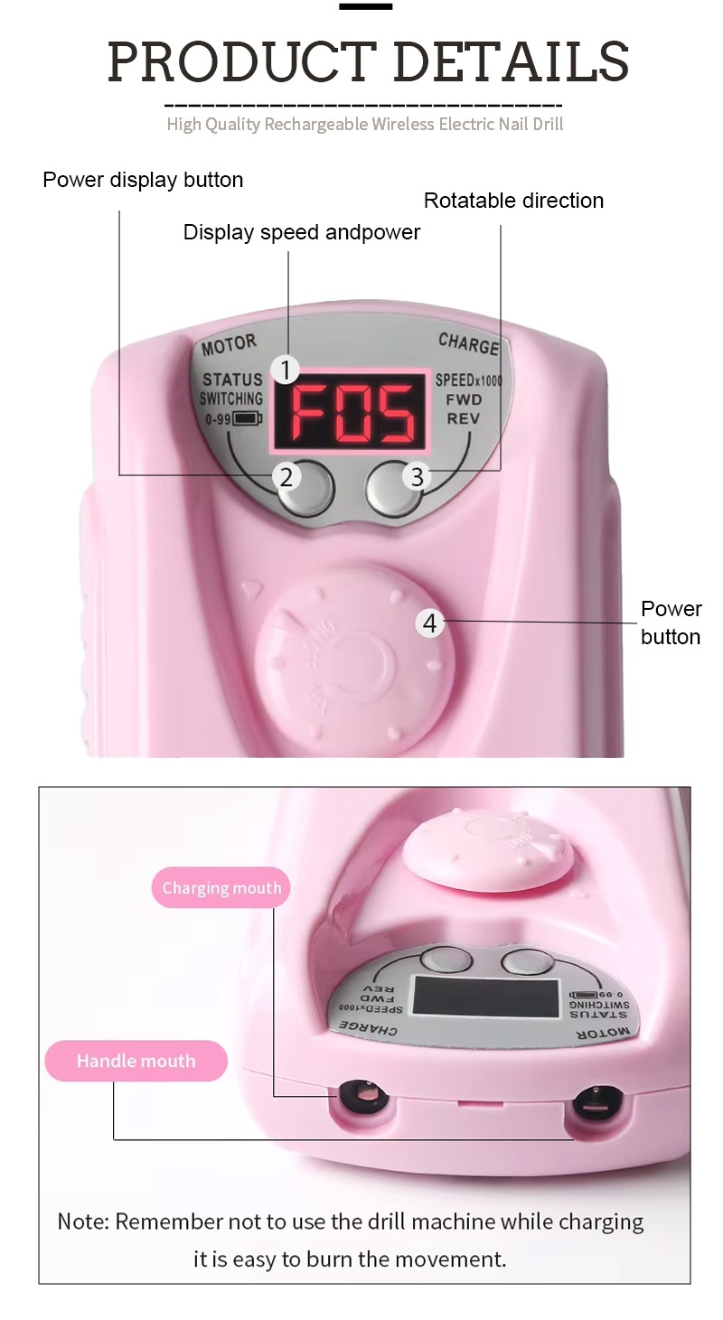 Tsarin nuni na wannan ƙwararren ƙusa na ƙusa na lantarki mara igiyar waya yana da maɓallin kunnawa / kashewa da juyawa / juyawa don jimlar kunna maɓalli guda ɗaya, soket mai saurin caji a ƙasa, ƙwanƙwasa mai maye gurbin a saman, da matsakaicin matsakaicin matsayi uku don saduwa da buƙatu iri-iri.