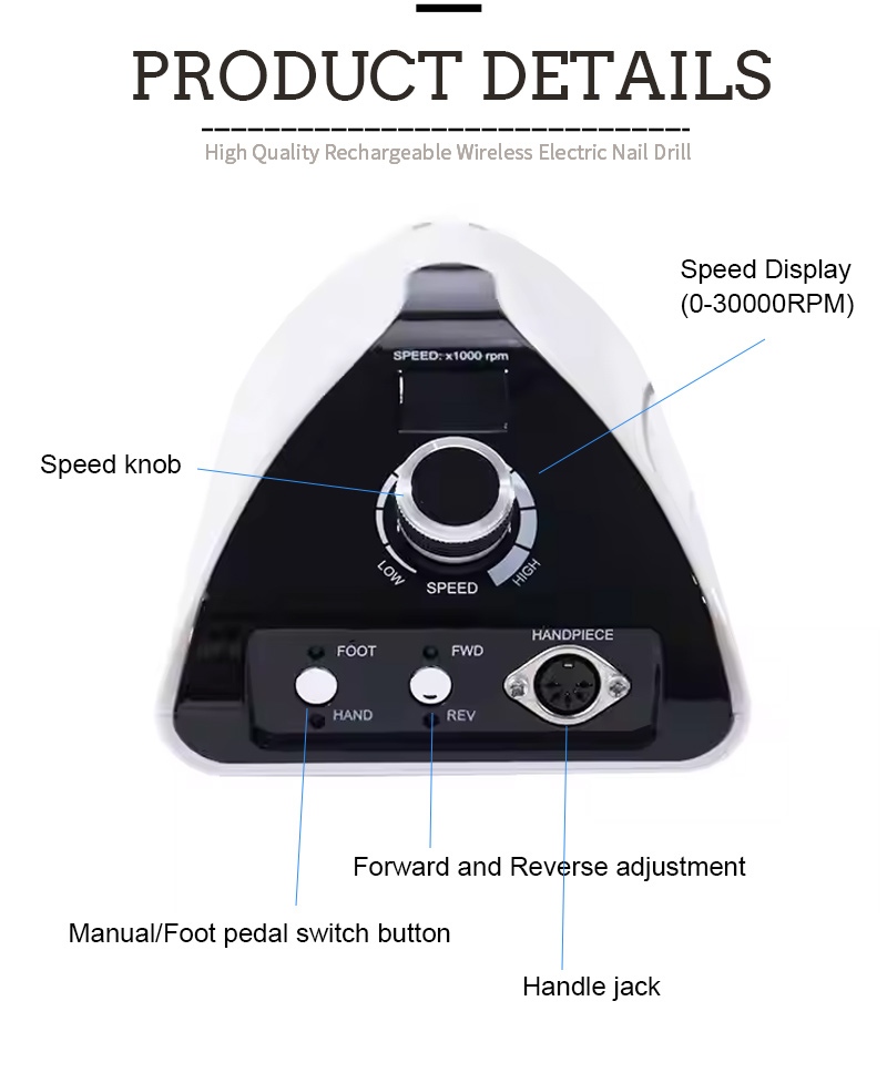Nunin nuni na wannan ƙwararrun ƙwararrun ƙusa mai ɗaukar ƙusa 35,000 rpm yana da kunnawa / kashewa da juyawa gaba / juyawa don jimlar kunna maɓalli guda ɗaya, soket mai saurin caji a ƙasa, soket ɗin rawar soja mai maye gurbin a saman, da matsakaicin matsakaicin matsayi uku don saduwa da buƙatu iri-iri.