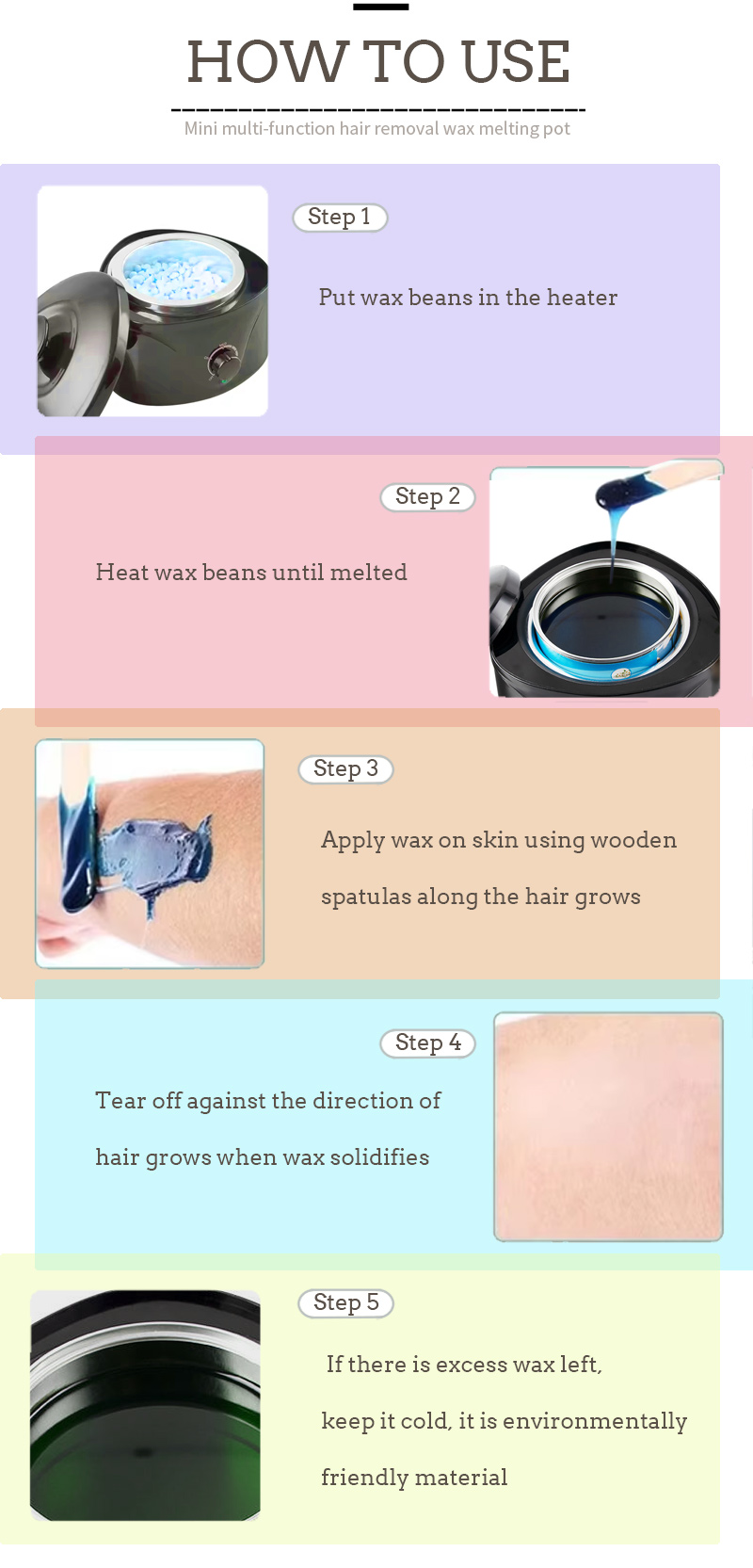 - Ya dace da kowane nau'in waxes: Hard daƙa da wuya, tsiri da ƙyallen, paraffin waxing
